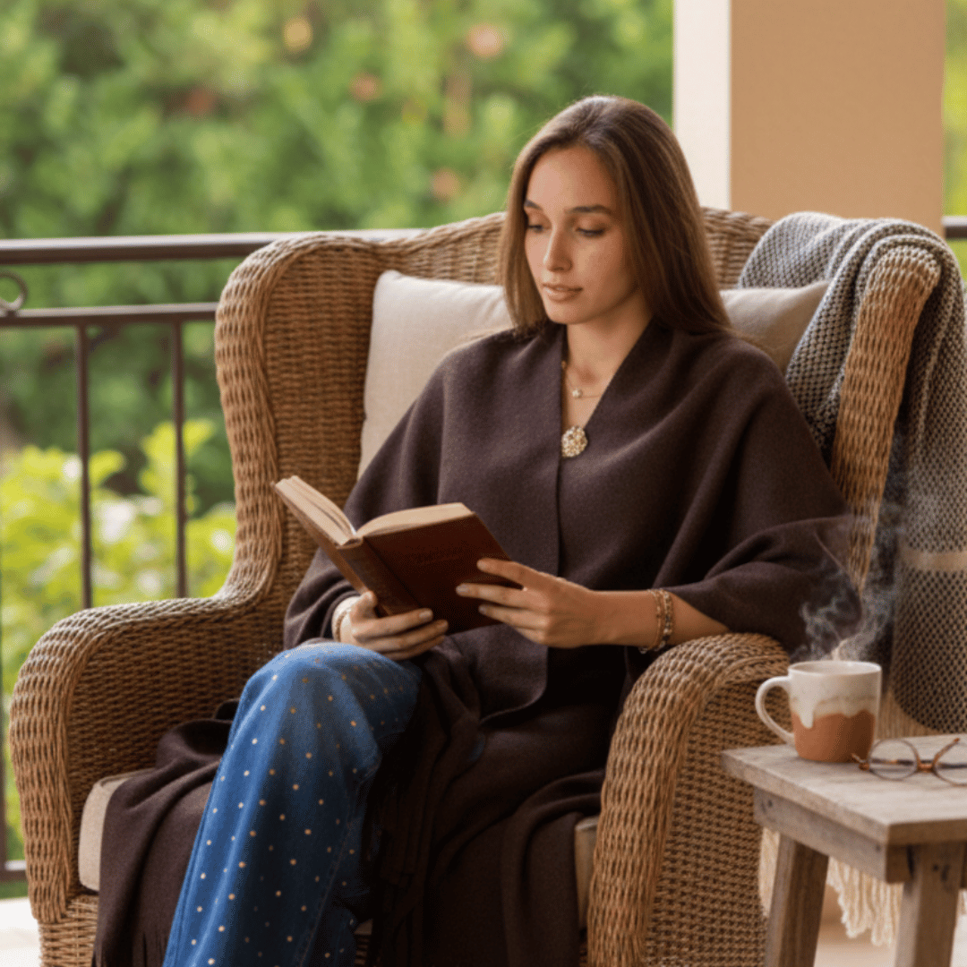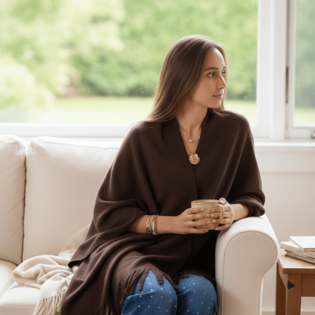 Soft fabric drapes gently, giving warmth without weight and making this shawl easy to wear.