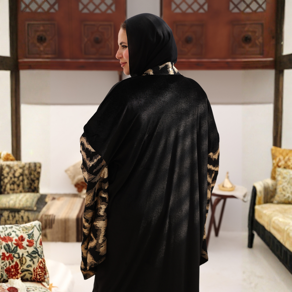 Crafted from black velvet with a luminous golden shimmer.