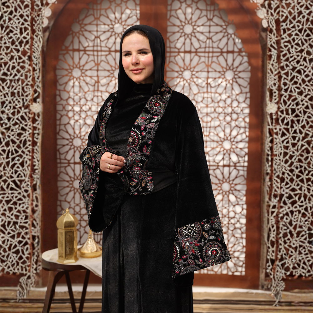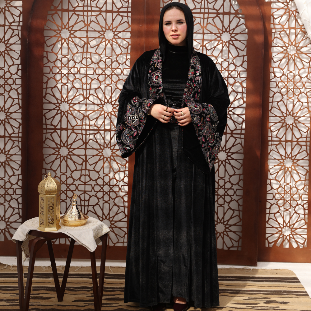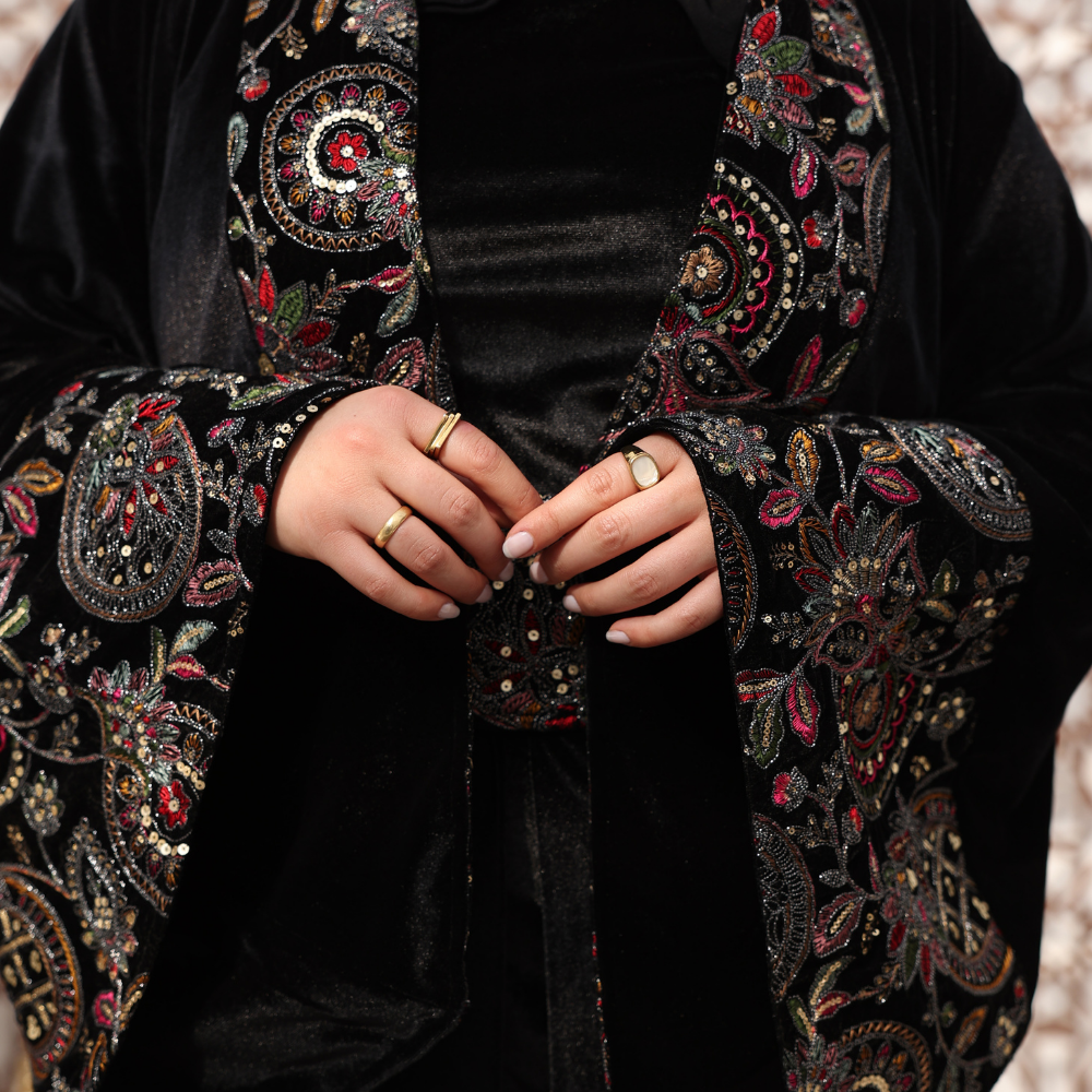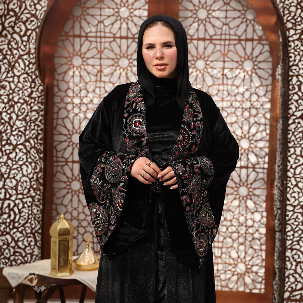 Crafted on a black velvet fabric that adds depth, warmth, and elegance.